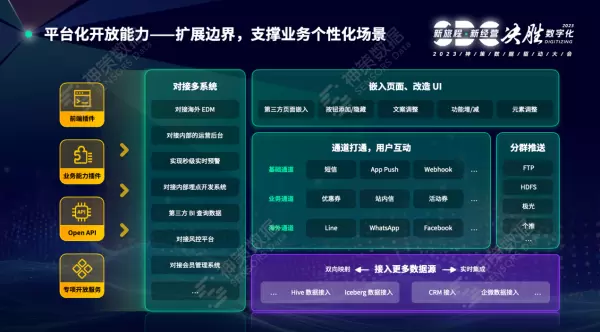 值得关注的是,为了更好地支持不同企业个性化的二次开发需求,神策数据持续扩展边界,开放了四大实用能力。第一,前端插件,嵌入页面,改造 UI;第二,业务能力插件,打通各类通道,接入更多数据源,实现分群推送;第三,Open API,对接各种内外部系统,加速数据流动,满足多业务场景需求;第四,专项开放服务,面向专项业务场景提供综合开放解决方案。