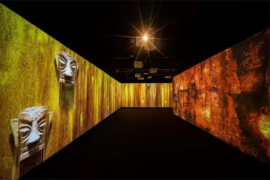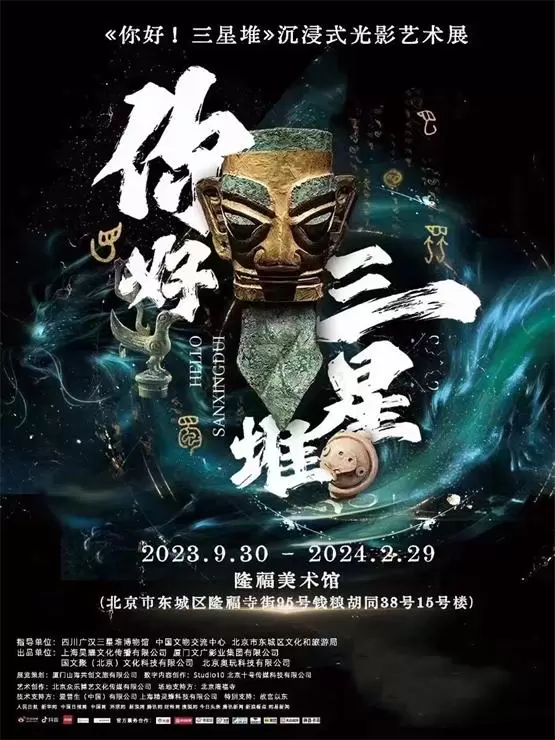 《你好!三星堆》沉浸式光影艺术展由中国文物交流中心、四川广汉三星堆博物馆、北京市东城区文旅局、北京新隆福等部门和单位共同指导;上海昊耀文化传播有限公司、厦门文广影业集团有限公司、国文聚(北京)文化科技有限公司、北京奥玩科技有限公司共同出品,展览时间持续至2024年2月29日,在隆福美术馆面向公众开放,将为观众呈现一场以三星堆文化为主题的多感官文化盛宴。