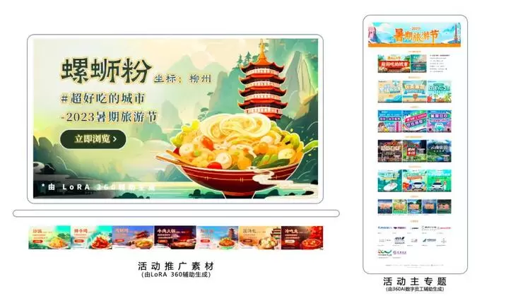 以AIGC赋能内容营销,360智慧商业携手携程旅行、曹操出行、山茶旅行、同程旅旅游联合发起快乐非你莫“暑”暑期旅游节专题活动。以360智脑大模型为驱动,360AI数字员工团队中的创意总监Lorrine与文案专家Donald分工协作,结合热点生成传播主题“超好吃的城市”及专题所需的内容文章;借助LoRA 360生成景区投放素材,以办公场景下PC第一媒体——360PC锁屏画报为主要阵地,通过原生态的PC大屏、沉浸式展现,传递审美价值,高效链接职场高净值客户。以覆盖用户工作、生活、娱乐、出行全场景的智能化营销产品,触达全网潜在人群,跨平台媒体打通,形成营销闭环。