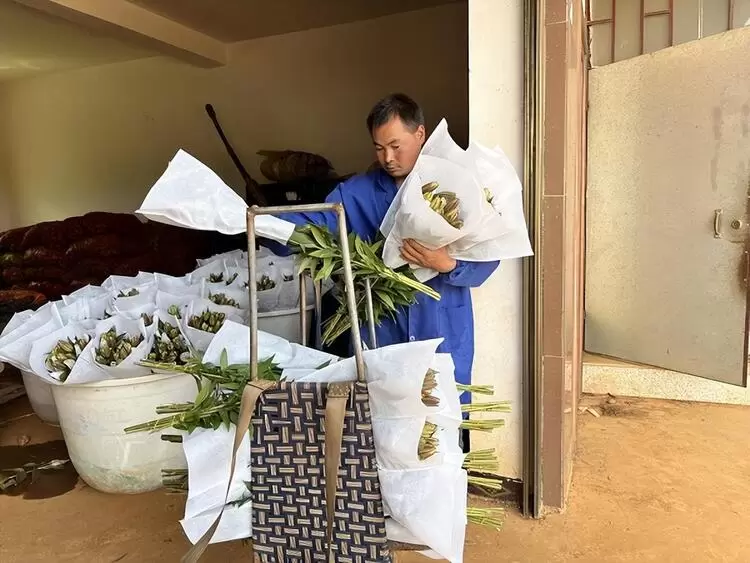 在施挎所的花场,满园的百合花含苞待放,长势喜人,记者见到施挎所时,他与妻子二人正忙着采摘、挑货、打包、装车……每年10月,都是鲜花销售的高峰期。这时的他,每天都忙于向昆明花卉市场运送新鲜花卉。据施挎所介绍,所种植的百合是分批种植的,好处在于能够延长收割时间,可以确保花卉的新鲜度。“我们所在的位置地处高山,一般是从每年4月开始分批种植,那时的天气比较适宜种植百合。一直持续到10月下旬,天气转凉,我们就开始休假了。”