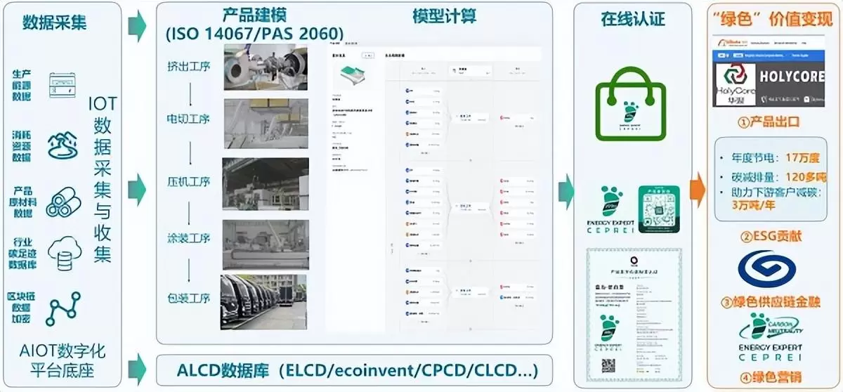 具体来说,华聚将涉及11个大小生产工序的48个能源计量设备接入能耗宝,能耗宝则通过在线数据采集和分析,为企业提供用能优化建议。例如,通过分析并调整重点能耗设备预加热的开关时间,来降低能耗。同时,能耗宝还帮助华聚了解自身整体用电情况、光伏的贡献度以及碳排放量水平,基于新能源发电预测和负荷预测算法,结合企业自身的用能特点,通过弹性分析用电负荷和经济容量优化,提出节能建议。此外,在产品碳足迹方面,能耗宝进行了一站式碳足迹建模、认证和营销支持(图表6)。