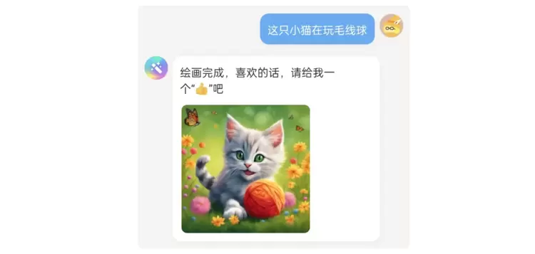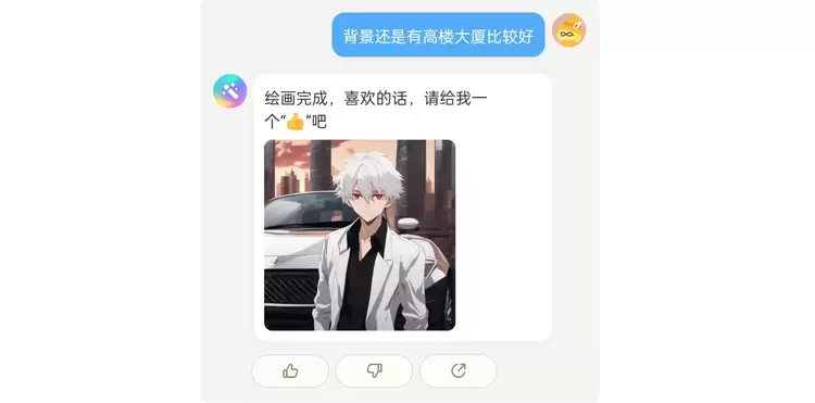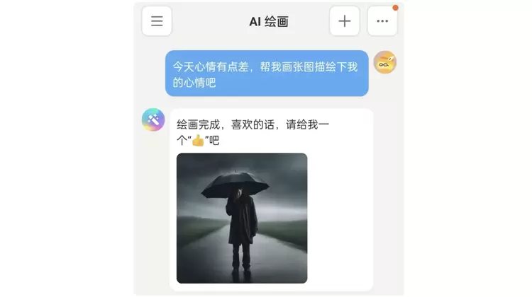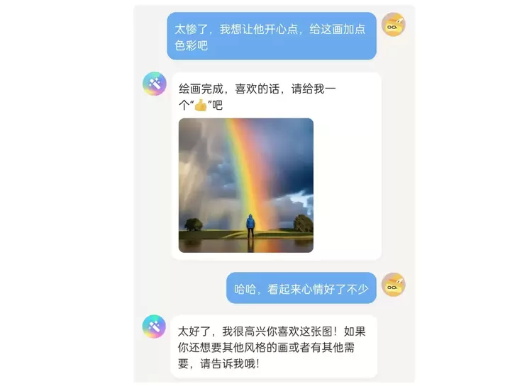 没想到,前两天被我百般刁难的 “乙方” AI 居然为小编画了张雨后天晴的景色,漂亮的彩虹让我的心情也愉快不少。我不由自主地回复了一句夸奖,没想到原以为只会画图的 AI 也放下了手中的活儿,识趣地和我互动起来。
