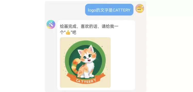 嗯,AI 交稿的审美是达标了,就是 AI 随机生成的文字肯定不能给老板看到呀!这 AI 还能自定义文字吗?我不抱期待地尝试输入 “LOGO 的文字是「Cattery」”,没想到现在的好说 AI 真听懂了: