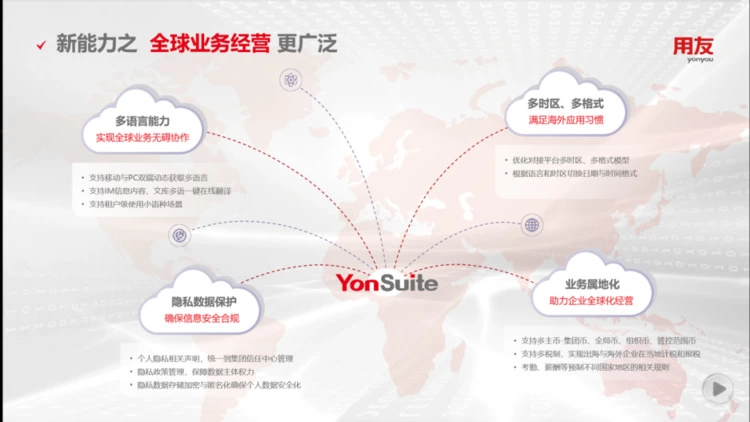 YonSuite首创的YMS云中间件技术、多租户多数据中心技术,可以实现公有云高可靠与实时扩展。在安全保障上YonSuite采用了全球主流架构,可确保用户的平台安全、应用安全与数据安全。凭借先进的微服务架构,具有易于集成和扩展的特性,可以方便地将其他系统或应用与YonSuite进行集成,实现数据的共享和交换。