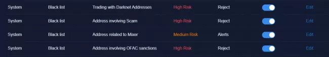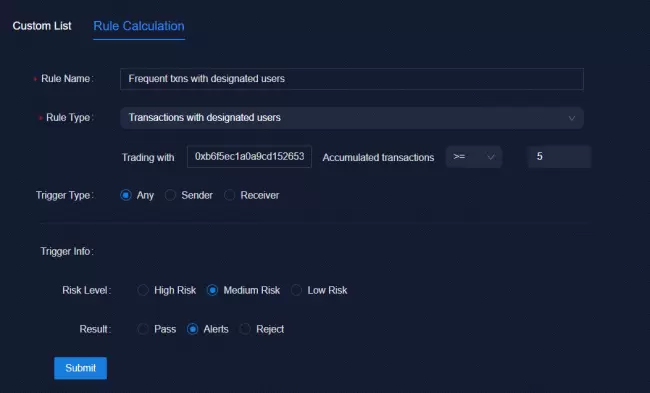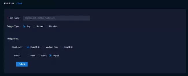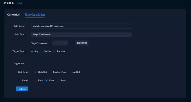 KYT规则与模型 支持多种规则类型模板和自定义规则配置,同时内置丰富的风险标签、黑名单数据源,对平台内的交易进行实时监测,确保符合合规要求。