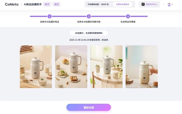 CeMetaAI商品图助手操作非常简单直白,让商家们零门槛拥有精美的小家电场景图!所有的抠图、适配场景、模型训练,都不用商家操心;既不用担心商品和场景不匹配,也不用学习AI作图的复杂咒语和一堆操作步骤,只要上传图,选张数和风格,就立等可取了。