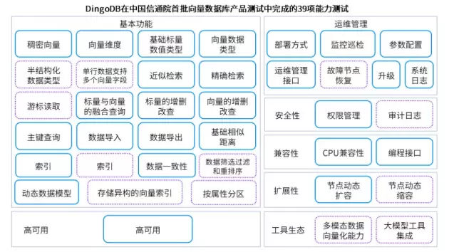 依据标准,向量数据库产品基础能力测试覆盖基本功能、运维管理、安全性、兼容性、扩展性、高可用、工具生态共7大能力域,共计47个测试项目,充分融合了国内行业专家丰富的实践经验与智慧,是对向量数据库基础能力的权威综合评判。此次测试中DingoDB的惊艳表现,再次印证了DingoDB的技术水准位于行业前沿,将为多模态大模型时代建设全新的“存储基建”提供关键力量。