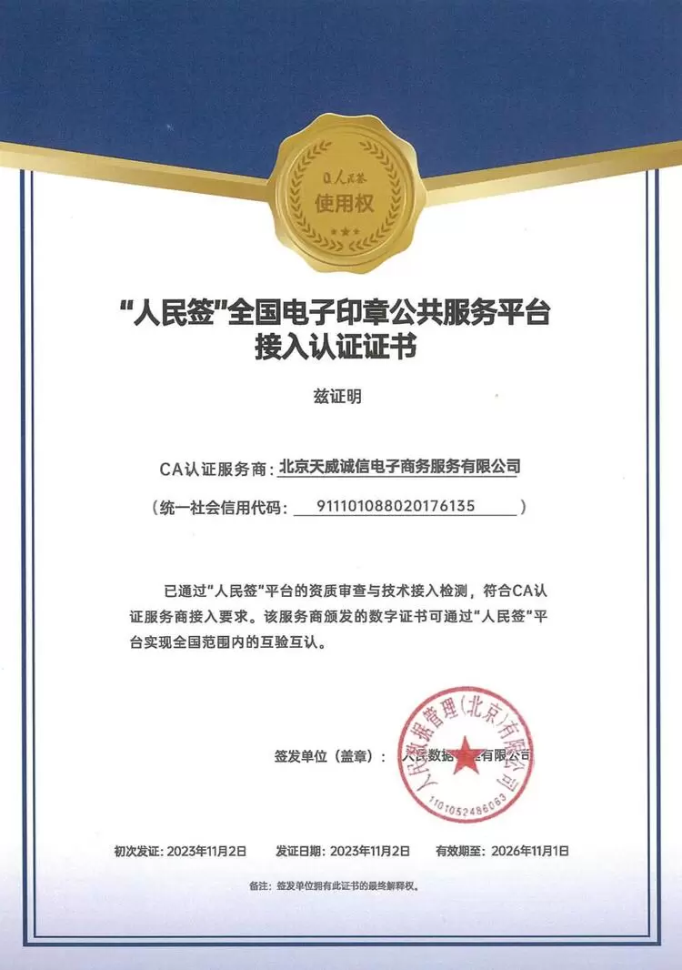 正式接入!天威诚信入驻“人民签”平台推进电子印章全国互认互通