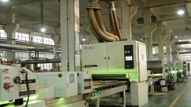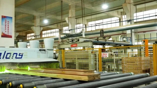 在群升科技园自动化生产车间内,无人化智能生产线上的木门像被上了发条一样,自动转换方向、自动封边,封边完成后又自动传送到生产线最后,被吸起来摞到一起。短短几分钟,一扇木门就制作完成,而且木门封边无缝贴合度高,尺寸标准。