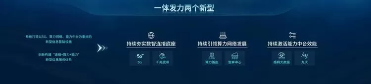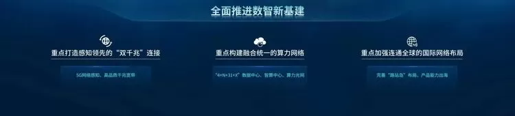 第一,全面推进数智新基建。加大资源投入,持续建强全球领先的新型信息基础设施,畅通全社会数智化转型“大动脉”。一是重点打造感知领先的“双千兆”连接。开展通感一体、无源物联等5G-A技术试点,全面提升5G网络感知。精准部署10G PON资源,全面提升端到端能力,打造高品质千兆宽带网络。二是重点构建融合统一的算力网络。深化“4+N+31+X”数据中心布局,强化东西算力协同。加快建设超大规模智算训练中心和边缘算力,增强多元算力供给能力。推进算力光网布局建设,实现400G OTN省际骨干网络商用,全力打造三级时延圈。三是重点加强连通全球的国际网络布局。完善全球“路、站、岛”布局,拓宽出海路由,推动优质产品和能力出海,快速提升国际连通能力。