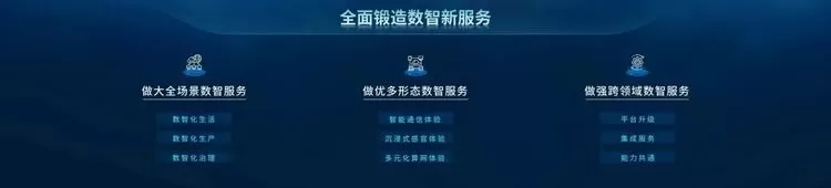 第二,全面锻造数智新服务。增强信息服务供给能力,让人民群众在共享信息化发展成果上有更多获得感。一是做大全场景数智服务。丰富数智化生活,升级咪咕视频、移动云盘、云游戏、超级SIM等特色产品,打造“人车家”端到端数智新体验。支撑数智化生产,聚焦垂直领域,共推移动云、5G行业创新应用。促进数智化治理,加快数字政府、智慧城市、数字乡村等成熟产品规模推广。二是做优多形态数智服务。规模推广5G新通话,打造更智能的通信体验。创新裸眼3D、数智人、云XR等产品形态,创造沉浸式的感官体验。丰富云手机、云高清、旺铺算力主机等终端产品,升级视联网应用,提供多元化的算网体验。三是做强跨领域数智服务。加快5G消息、和家亲、9 one平台等向能力平台升级,推广“通信+终端”“通信+内容”“内容+科技”“能力+产品”等集成式服务,推动产业各方能力共通、优势互补。打造数智服务“产品雁阵”,形成亿级、十亿级、百亿级收入的产品体系,更好满足需求、引领需求、创造需求。