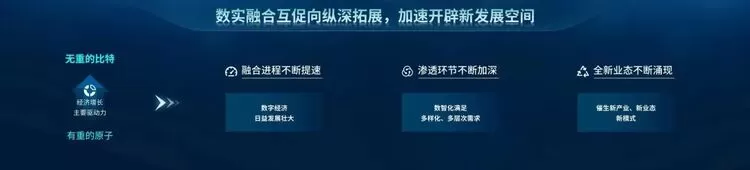 三是数实融合互促向纵深拓展,加速开辟新的发展空间。随着人类社会加速进入以信息为主导、信息和能量融合创新的全新阶段,无重量的“比特”日益取代有重量的“原子”成为经济增长的主要驱动力。数字经济和实体经济在更大范围、更宽领域、更深层次的融合发展和协同互促,必将为人类社会创造出更大的发展空间。融合进程不断提速,信息技术同实体经济的融合显著加快,推动数字经济日益发展壮大。渗透环节不断加深,数智化已成为高效满足经济社会发展多层次、多样化需求的重要手段。全新业态不断涌现,新应用层出不穷,数智人、元宇宙等新模式在电商直播、体育赛事等多领域深度运用,不断催生新产业、新业态、新模式。