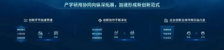 二是产学研用协同向纵深拓展,加速形成新的创新范式。当今世界已进入大科学时代,跨学科交叉不断深化,驱动创新范式发生显著变化。创新环节加速贯通,基础理论、工程实践、应用培育等创新环节有机贯通,形成产品功能质量持续迭代优化的“飞轮效应”,促进科技成果从“书架”向“货架”快速转化。创新协作不断深化,多主体协同、跨行业联动、多链条融合,通过策源性技术突破,高效破解产业关键堵点,促进科技创新从“独唱”向“合唱”协奏共鸣。企业创新主体作用日益凸显,拥有海量数据、丰富场景,能够更好汇聚各领域创新资源和知识能力,在科技创新中的作用从“助攻”向“主攻”加速转变。