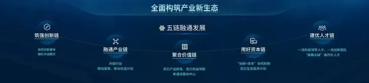第四,全面构筑产业新生态。深化创新链、产业链、价值链、资本链、人才链“五链融通发展”,引导集聚产业要素、优化产业布局、培育产业人才、提升产业能级。一是筑强创新链。完善协同创新基地布局,支撑产业伙伴研发合作、创新孵化、集群构建。升级打造5G创新联合体,深入推进“联创+”计划,深化运用编队作战模式,产出一批硬核科技成果。二是融通产业链。推进产业链融通发展共链行动,全面升级“十百千万”合作伙伴计划,以平台建设、机制配套、资源投入,助力产业高质量发展。推出“移动爱家”生态合作计划、“移动优选”合作计划,共同开拓智慧家庭、智能终端等重点领域。三是聚合价值链。投入百亿级资源,推出百亿产品研发计划、百亿权益领航计划,成立新通话联创中心、IoT生态合作联盟等,与产业伙伴共推应用、共创价值、共享利益。四是用好资本链。完善“创新+资本”协同机制,借助“链长”基金、直投等手段,推进百亿生态投资计划,扩大战略投资,强化新兴产业投资布局,着力打造一批产研投用协同典范。五是建优人才链。集聚产业各方创新资源和人才资源,在重大科研任务中培养一流科技领军人才和一流创新团队。着力营造有利于人才成长的土壤环境,培育和引进“高精尖缺”海内外人才。