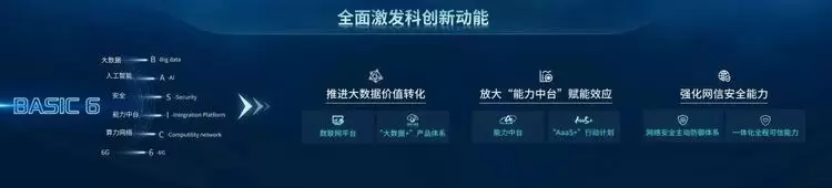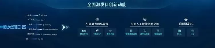 第三,全面激发科创新动能。把科技创新作为构建企业核心竞争力、增强核心功能的关键抓手,面向“六大领域”实施“BASIC6”科创计划(B-Big data、A-AI、S-Security、I-Integration Platform、C-Computility network、6-6G。),加快培育壮大战略性新兴产业集群。一是引领算力网络发展。推动全社会算力并网纳管和集约高效利用,研发“算龙头”,提供“一点接入、即时服务、多元异构、按需调度”的算力服务。启动算网大脑试商用,全景呈现和灵活调度移动云全部算力、存力、运力和能力,支撑算网产业发展。前瞻布局量子云平台、量子编译器等领域,推进量子计算与经典计算融合。二是加速人工智能创新突破。深化“大算力、大数据、大模型”融合创新,构建涵盖智算基础设施、“1+N”通专结合大模型、X智能应用的核心能力体系。依托国资人工智能大平台,强化开放合作,深度赋能千行百业数智化转型,让AI不仅会“作诗”、更要会“做事”。三是前瞻研发6G。推进5G-A技术产业成熟和应用创新,布局6G新材料、新工艺、新器件等关键环节,推动形成全球统一的6G标准体系,引领产业前瞻布局、加速成熟。四是推进大数据价值转化。建优数联网平台,提供数据流通治理一站式解决方案,促进数据合规高效流通使用。丰富“大数据+”产品体系,推动数据从资源向资产、资本转变。五是放大“能力中台”赋能效应。打造国家级、产业级能力中台,依托“AaaS+”行动计划,推动更多优质能力“引进来”和“走出去”,使能力中台成为赋能全社会创新、产业转型升级的重要载体。六是强化网信安全能力。建强网络安全主动防御体系,打造一体化全程可信能力,在5G-A/6G、算力网络、SIM认证等领域,实现内生安全突破,筑牢产业安全屏障。