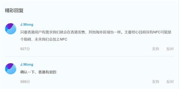 黄章回应:“只要香港用户有需求我们就会在香港发售,主要担心目前没有NFC功能可能是个阻碍,未来我们会加上NFC”。
