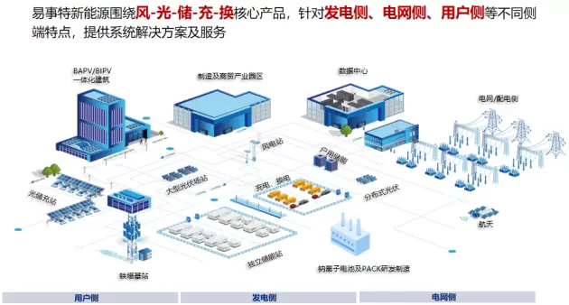 在能源产业方面,易事特风光储充产品及解决方案广泛应用于海内外,现持有运营已实现并网的地面光伏电站和分布式光伏站近700MW;储能、充换电等不断推陈出新,相关项目遍地开花,打开了涵盖发电侧、电网侧、用户侧的巨大市场;服务于国家能源、国电投、大唐、三峡、华电、中核、国家电网、南方电网、中石化、中石油、中海油、广东能源、昌吉国投、浙江交投、桂林交投、湖北交投等“五大六小”“两网”“三桶油”和地方能源企业,广受赞誉。此外,还在钠电、储能、充电桩三个板块单独设立拟上市公司,力争早日进入资本市场。