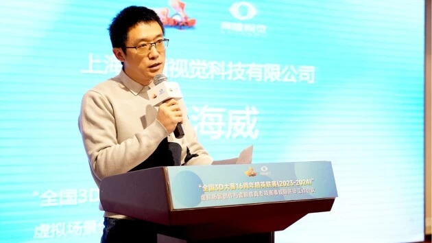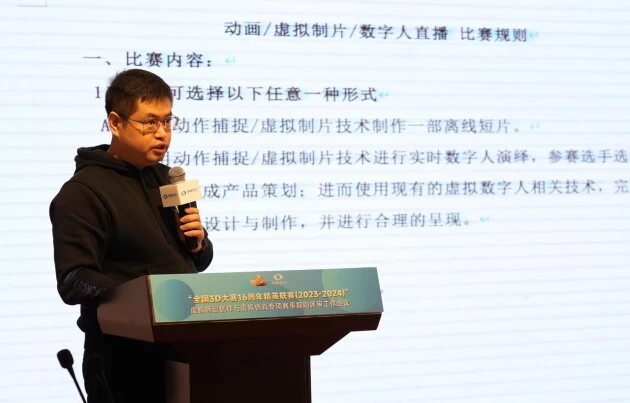 会上,上海青瞳视觉科技有限公司销售总监胡世豪介绍了虚拟场景创作与虚拟仿真专项赛的赛事方案及赛项规程,其中提到了大赛制作所用到的动作捕捉技术或者XR虚拟拍摄技术的数字模型的制作、技术方案的应用价值以及国赛的分区赛规则等。同时提到了国赛的作品要求和评分方法,如最佳动画表演奖、最佳视觉效果奖、技术创新奖等。