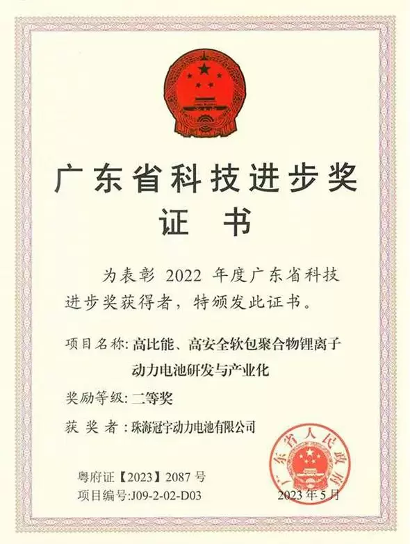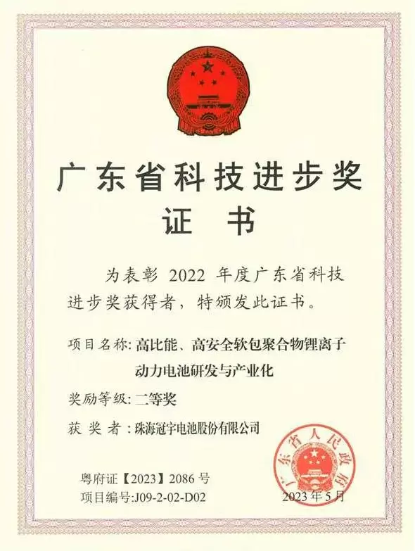 不久前,2022年度广东省科学技术奖获奖名单正式公布,冠宇集团参与完成的“高比能、高安全软包聚合物锂离子动力电池研发与产业化”项目荣获广东省科技进步奖二等奖。