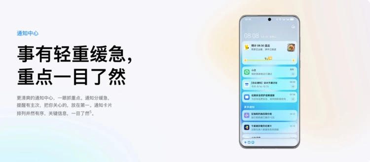 对于刚刚完成升级的用户,相对于个性主题,实况窗等好玩高效的功能,全新通知中心也一改常规时间顺序呈现逻辑方式,而是对其信息重要程度进行分级。如实况通知、社交通讯等重要通知自动置顶。其它更多通知,比如营销资讯等则置于通知中心统一区域显示,让信息轻重缓急一目了然。同时相同应用的不同信息系统还将自动折叠,点击即可展开查看详情,避免错过重要信息沟通和回复。