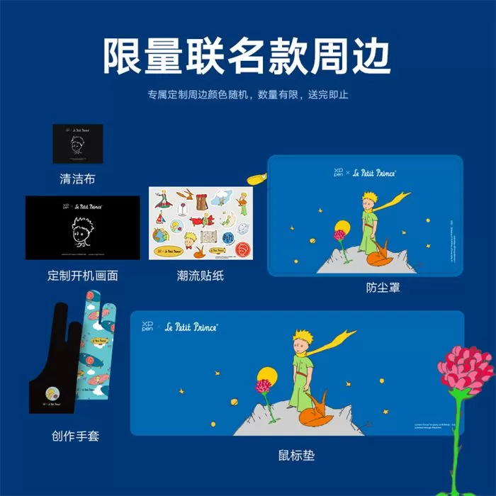 为了更好地将《小王子》元素融入Artist手绘屏,XPPen也对此次产品礼包进行升级。特别定制了小王子风格的防护包、鼠标垫、贴纸以及绘画手套等等,为喜爱小王子的圈层用户提供独特的创作氛围和情感体验。