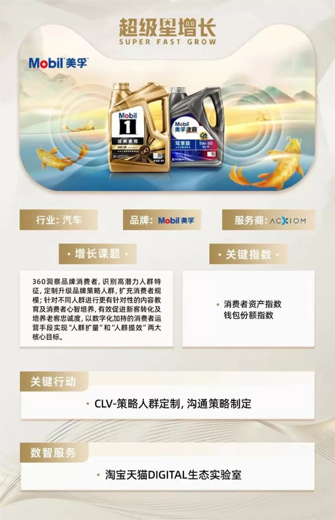 因此,美孚品牌联合服务商安客诚,与天猫超级旗舰计划合作将运营重点聚焦在开发新高潜力人群识别和策略制定上,依托淘宝天猫DIGITAL生态实验室开放数智空间形成长期生意洞察和运营方案: