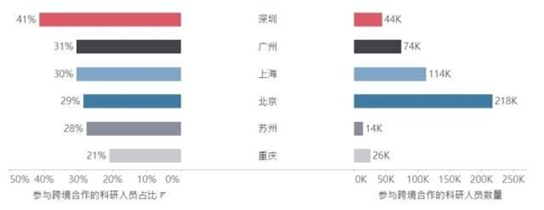 各城市参与跨境合作的科研人员数量与占比(2018-2022)。(图片来源:《国内城市科创人才对比分析——暨深圳市科技创新人才发展报告》)