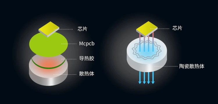 将LED光源直接贴在陶瓷散热体上,陶瓷材料本身导热不导电的特性,单个陶瓷就成为了一个独立的散热体,热量通过空气对流直接散发到环境中,形成“独立散热体散热+空气自然对流散热”的双重散热效应,散热路径短,整体散热效率更高。使LED光源的结温温度更低,大大延长了LED的使用寿命,提高了灯具的可靠性。