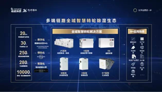该解决方案推出了从JF系列到S/T系列6款除湿机,研发独家核心算法做到-70°C超低露点、提效20%强劲除湿、极强耐候性、可达0.1%超精准控制等突破性功能。这些产品涵盖了各类场景的湿度管理需求。无论是家庭、办公场所,还是工业制造等特殊环境,都能提供精准、高效的湿度控制,真正做到“全域”。