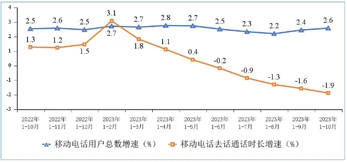 移动语音和短信业务持续收缩。1—10月份,移动电话去话通话时长完成1.87万亿分钟,同比下降1.9%;固定电话主叫通话时长完成664.7亿分钟,同比下降4.5%。1—10月份,全国移动短信业务量同比增长1.3%,增速较前三季度回落1.1%;移动短信业务收入同比下降1.1%,降幅较前三季度收窄0.1%。