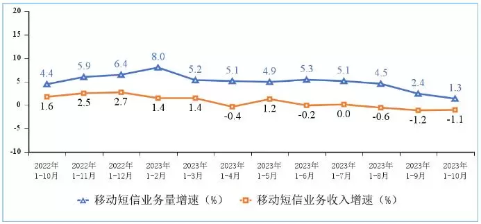 今天上午工信部发布2023年1—10月份通信业经济运行情况,统计显示:1—10月份,全国移动短信业务量同比增长1.3%,增速较前三季度回落1.1%。