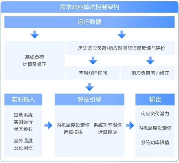 在众多用电设备中,空调负荷是电网峰谷负荷差持续扩大、尖峰负荷凸显的重要原因之一。根据中国电力科学研究院和国家电网浙江省电力有限公司调研数据显示,浙江省夏季用电高峰期空调负荷占社会用电总负荷的近40%。为解决这一难题,组建了美的楼宇科技先行研究中心,氟机产品公司,楼宇科技研究院,用户服务部等全价值链虚拟电厂项目团队,面向美的多联机系统参与电力需求响应业务,在核心技术上,设计开发了一套兼顾响应负荷预测、控制及末端用户舒适度的算法控制架构;在服务保障上,构建了一套全价值链快速响应无忧服务体系。