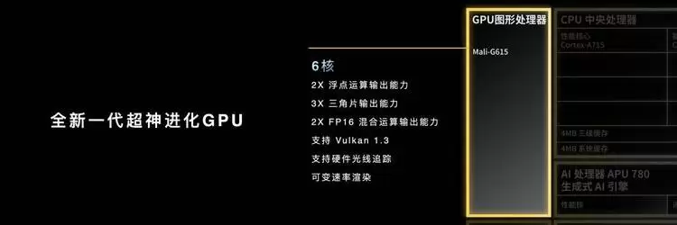 在GPU方面,天玑8300搭载6核Mali-G615高性能GPU,重点优化了浮点运算、三角片和混合运算能力,GPU峰值性能相比上一代提升60%,在重载场景下GPU峰值性能甚至可以提升82%,图形计算能力大幅提升!而且,天玑8300还支持Vulkan 1.3、硬件光线追踪和可变速率渲染等旗舰级游戏技术,不仅游戏体验更加流畅,画面也会比同级产品更炫。