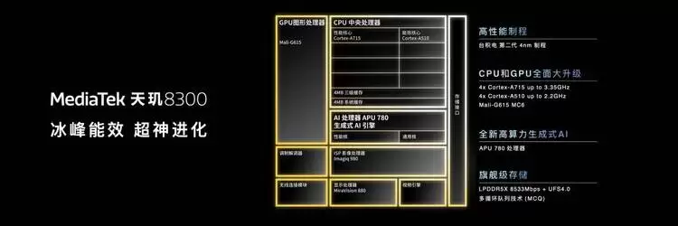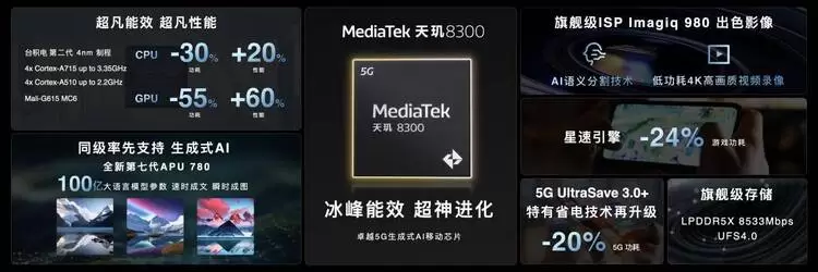 天玑8300同级首发支持生成式AI,搭载天玑9300同架构的联发科第七代APU处理器,具有旗舰级的AI算力。