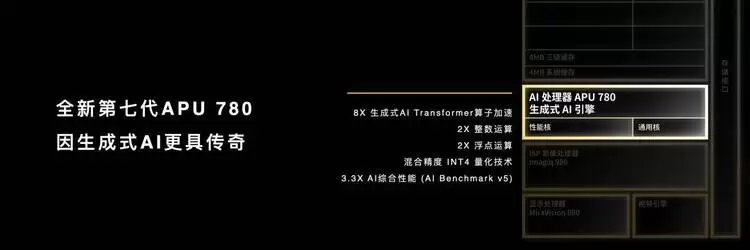 天玑8300的APU 780与天玑9300的APU 790一脉相承,同样搭载先进的生成式AI引擎,Transformer算子加速是前一代的8倍,整数运算和浮点运算的性能是上一代的2倍。同时,它还支持混合精度INT4量化技术,AI综合性能较上一代产品提升了3倍以上。