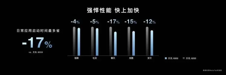 在如此出色的CPU能效加持下,天玑8300在日常应用的多个应用场景中均可降低功耗,日常最高可降低25%(游戏),这极大的强化了手机终端的续航能力。同时,天玑8300性能升级让日常应用的启动速度也获得大幅提升,最高快了17%,这样的进化相信手机用户能直观的感受得到。