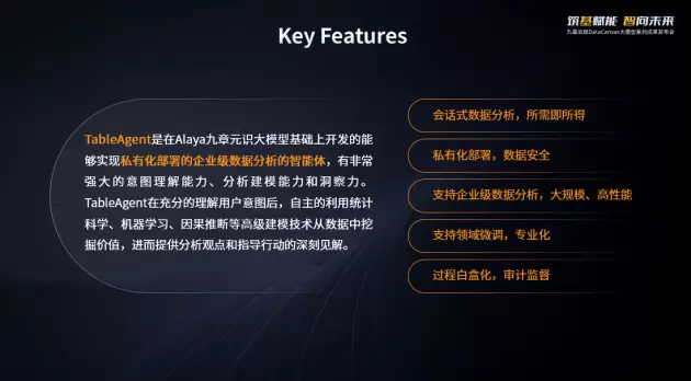 在应用场景中,九章云极DataCanvas以Alaya元识大模型和LLMOps大模型工具链为基础研发出TableAgent数据分析智能体,TableAgent在充分的理解用户意图后,能够自主地利用统计科学、机器学习、因果推断等高级建模技术从数据中挖掘价值,进而提供分析观点和指导行动的深刻见解,实现人人都是数据分析师。