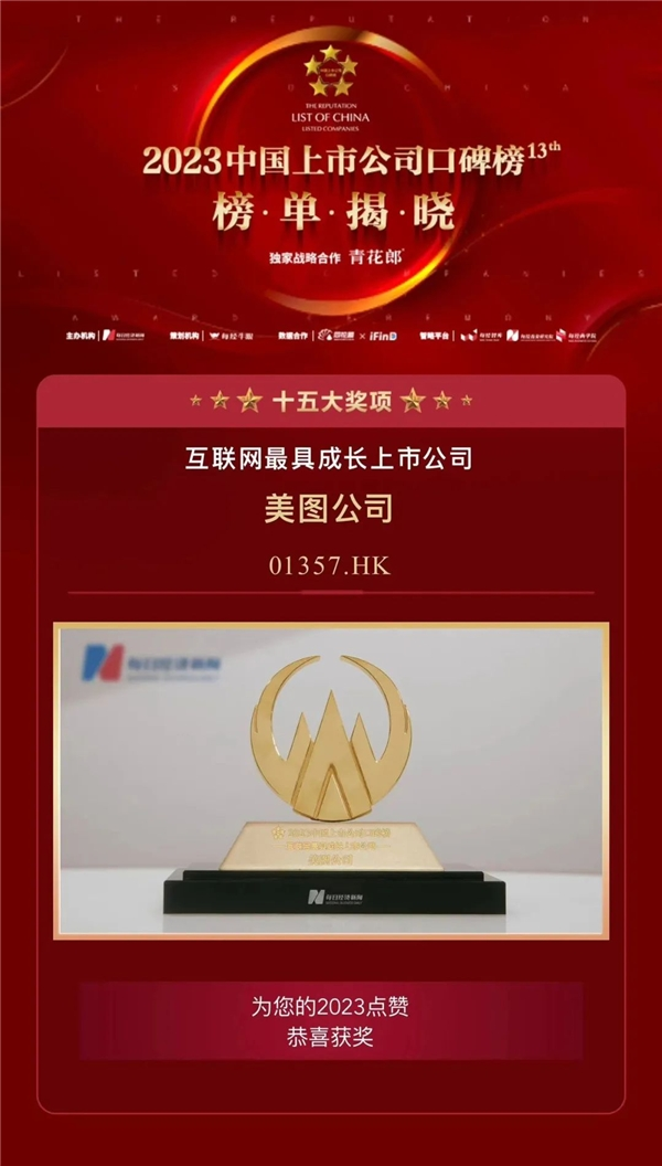 美图公司获“2023互联网最具成长上市公司”荣誉