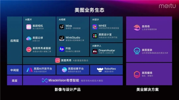 作为港股上市公司互联网科技领域的代表企业,2023年,美图公司结合用户需求和行业趋势,拥抱人工智能,全面推动人工智能与旗下影像应用的融合,完成人工智能产品生态的搭建,形成了由底层、中间层和应用层构建的人工智能产品生态。