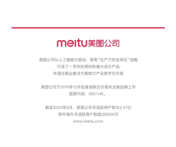 美图公司相关负责人表示,美图将秉承“让科技与艺术美好交汇”的使命,始终关注用户和行业伙伴的需求,持续从“生活场景”向“生产力场景”进阶,在未来打开更大的成长动能和增长潜力。