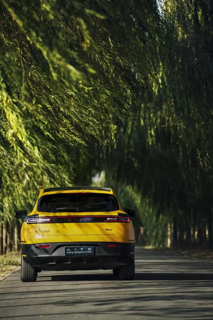 而尾部,问界M5 都市焕彩套装也营造出了造型饱满,还极具立体感的视觉效果。贯穿式鹰翼尾灯更是整个车尾的点睛之笔,在“曙光黄”的映衬下,点亮效果十分醒目。