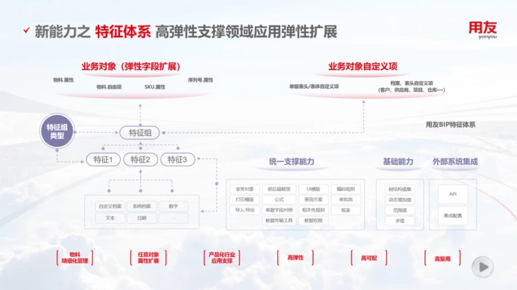 特征体系:特征体系是YonSuite的六大先进应用架构之一。它允许用户在全局范围内灵活增加系统字段或自定义单据报表。此外,新增的字段内容可参与各类计算并嵌入审批流控制,同时,通过API与外部系统进行集成。其最大的亮点在于无需深入开发,只需通过配置即可达到高度个性化应用,满足特定领域和行业需求。