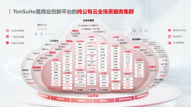 相对地,用友YonSuite则为快速成长的创新企业提供全方位的SaaS服务,包括但不限于:财务会计、管理会计、费控服务、财资服务、绩效服务、档案服务、人力服务、协同服务、营销服务、采购服务、供应链服务、制造服务、项目服务、资产服务等多个领域。这种“全方位”的服务特点意味着高性价比。YonSuite允许企业从企业级应用开始,随着成长逐步扩展,并支持集团、多组织和产业链等架构。基于统一平台的多场景和业务架构提供了广阔的数字化发展空间。