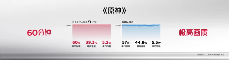 有了这么强大的性能输出,游戏表现肯定让人期待,凭借红魔的出色调教能力,红魔9 Pro系列在《原神》、《崩坏:星穹铁道》这些性能手游中都能实现最高画质全程满帧运行,而且功耗和温度也是控制的非常出色。《原神》60min测试中,红魔9 Pro在全程帧率跑满的情况下,最高温度仅为39.3度,平均功耗也只有5.2W,这个表现比专门优化过的iOS版本在iPhone 14 Pro上的表现还要出色。
