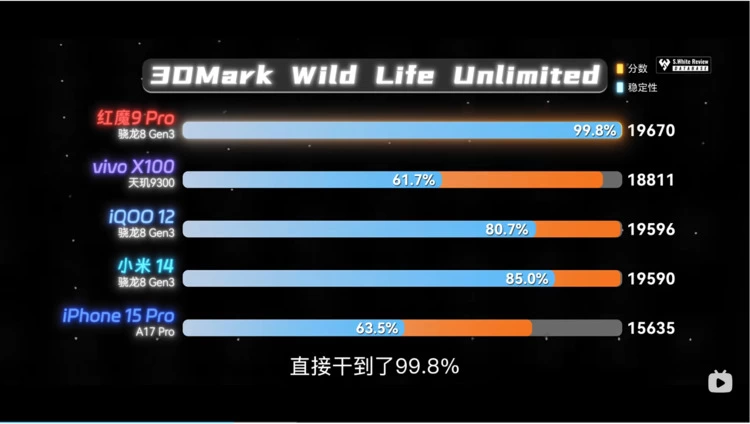 从媒体的评测结果来看,红魔9 Pro系列的性能也是真能打,主要突出一个字,“稳”。即使在极端测试环境下,也能保证一骑绝尘的高性能稳定输出。根据小白测评的测试结果,红魔9 Pro在3Dmark Wild Life Unlimited的GPU性能测试中,不仅分数力压一众最新旗舰机型,在稳定性上更是达到了惊人的99.8%,可以说是没有对手了。从数据上可以看到其实小米14和iQOO 12的稳定性也都达到了80%以上,可见今年的第三代骁龙8在性能稳定性上的优势还是非常明显的。