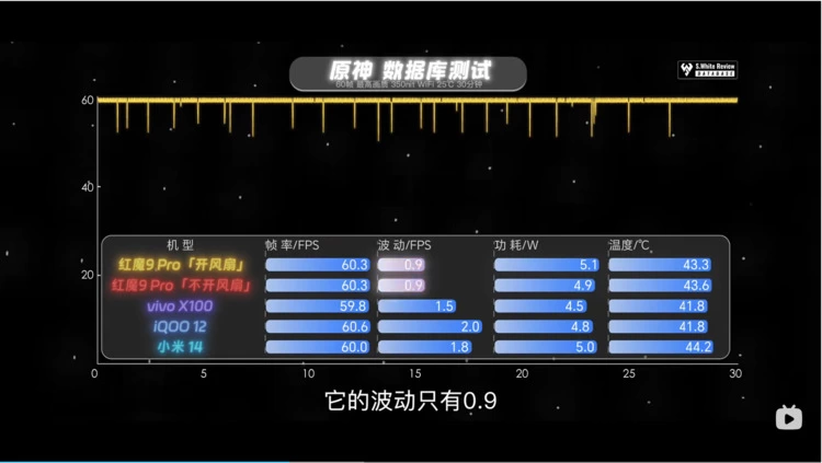 在游戏测试中,红魔9 Pro也把“稳”发挥到了极致,小白测评王者荣耀数据库测试中,红魔的帧率波动只有0.2,原神数据库测试也只有惊人的0.9,而且帧率曲线是真“一条直线”,看来想要最流畅丝滑的游戏体验,那就非红魔9 Pro系列莫属了。