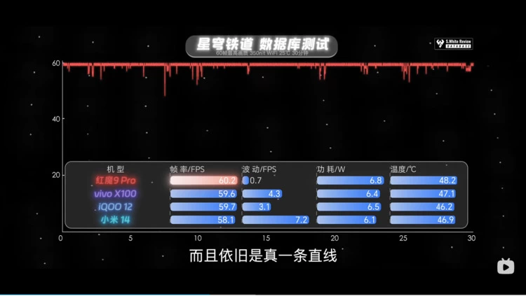 接下来再来看看最新“跑分工具”星铁,这次红魔不仅再次拉满帧率,也真正和其他安卓旗舰拉开了差距。其帧率波动只有0.7,相比第二名iQOO 12的3.1和第三名vivo X100的4.3,优势相当明显,而且功耗只有6.8W,且全程没有降亮度。