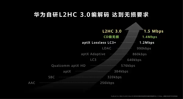 音频信号的传输需要先在播放设备完成编码,并在耳机端进行解码。因此无损传输的实现还需要无损编解码的“保驾护航”。华为自研L2HC 3.0音频编解码协议,采用自研专利技术,保障在高码率下对音频文件进行流畅高效的bit级无损压缩还原。配合麒麟A2芯片的传输能力,华为FreeBuds Pro 3端到端实现了1.5Mbps无损传输。