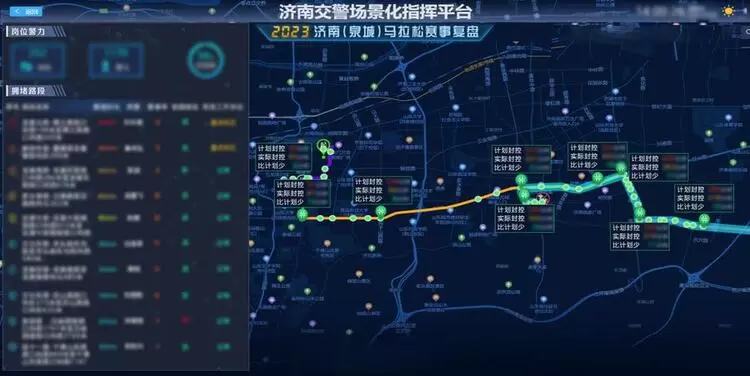 对此,海信助力济南交警实现活动全要素一图展示。通过划分疏导区、分流区、管控区,全景刻画马拉松运行状态,路线、警力、视频等15种要素全部上图,实时更新比赛队伍位置和分布,精准掌握各区域交通态势,成为交通保障任务行之有效的“顺风耳与千里眼”。