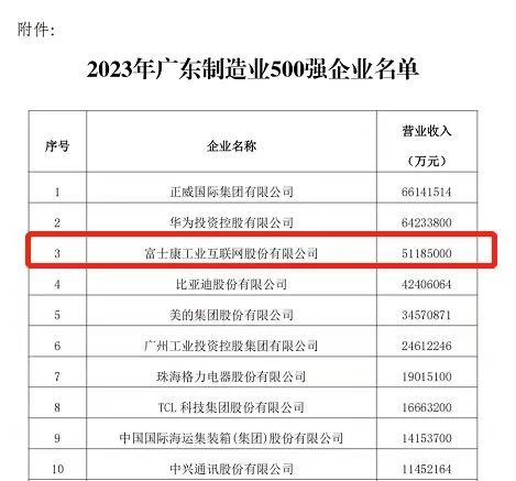 工业富联位居2023年广东省制造业企业500强前三